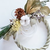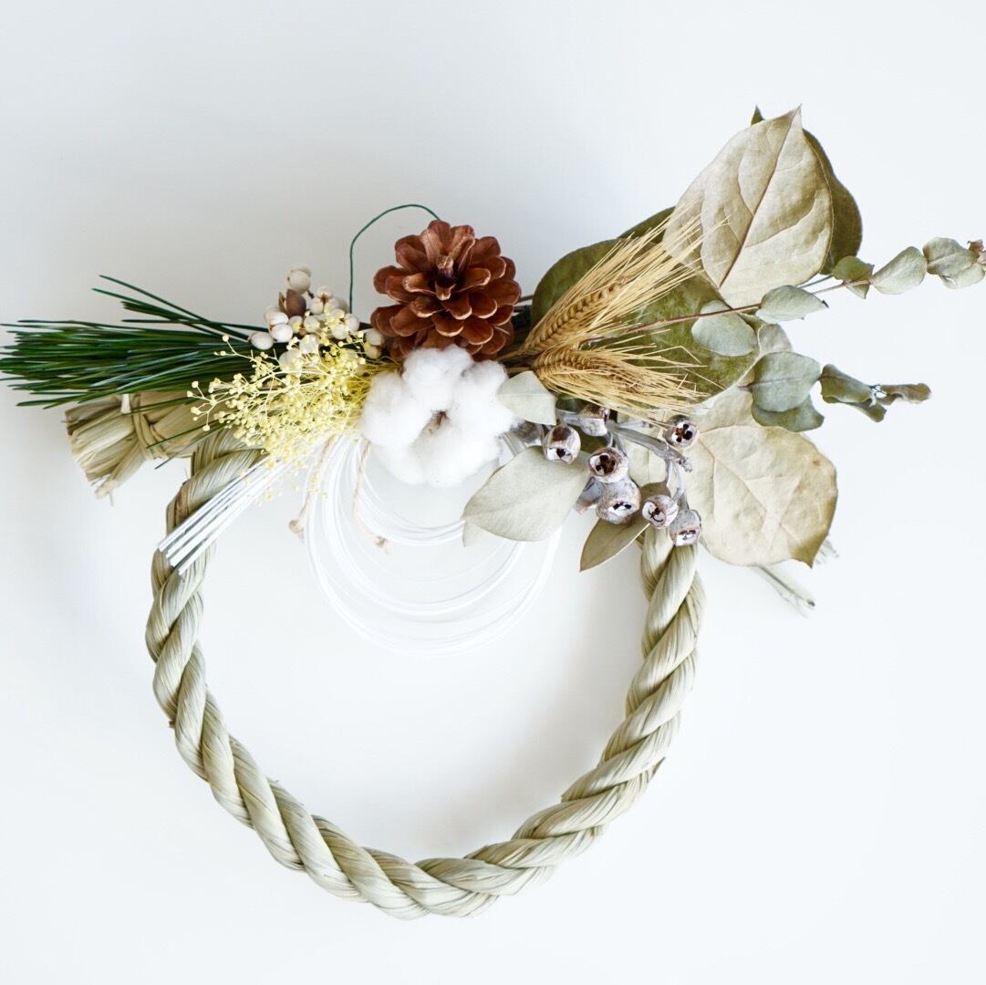 コットンフラワー、南京ハゼ、ユーカリ、ユーカリ実、レモンリーフ、麦、プリザーブドフラワー松、プリザーブドフラワーカスミソウ、松笠、水引、しめ縄、など